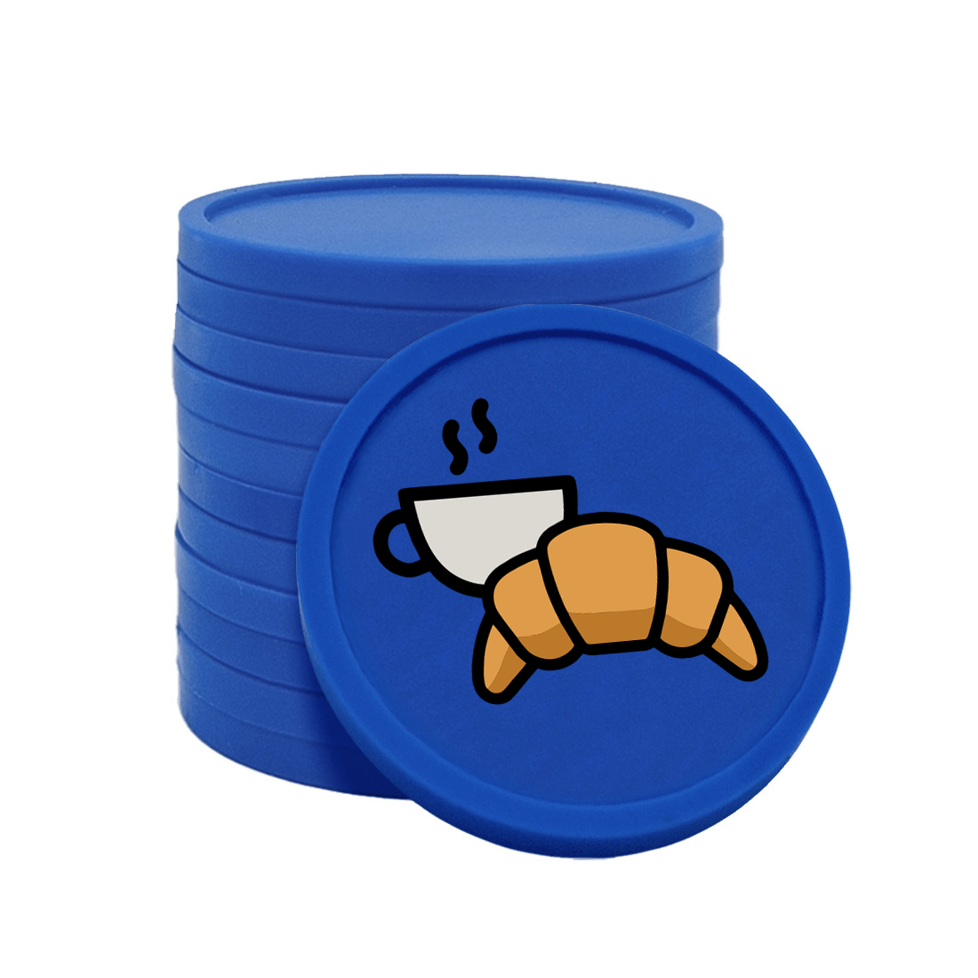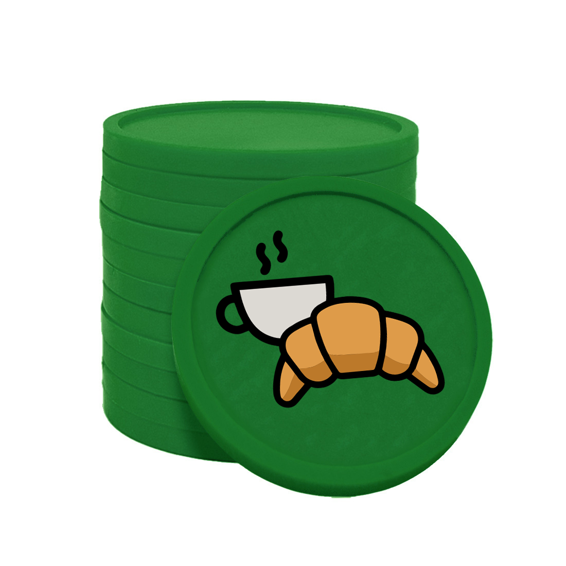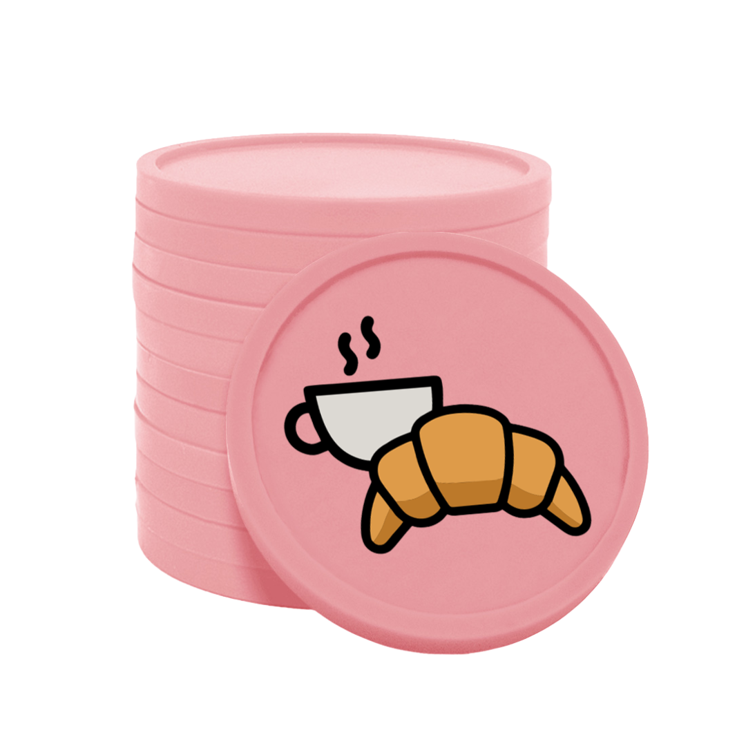 Fichas de plástico de 29 mm con impreso a color, que representan un croissant y café. Todas las fichas tienen un borde elevado y un grosor de 2,35 mm. estas fichas son muy prácticas a la hora de pagar en la barra de refrescos o en el puesto de comida. Se presentan en paquetes de 100 unidades.