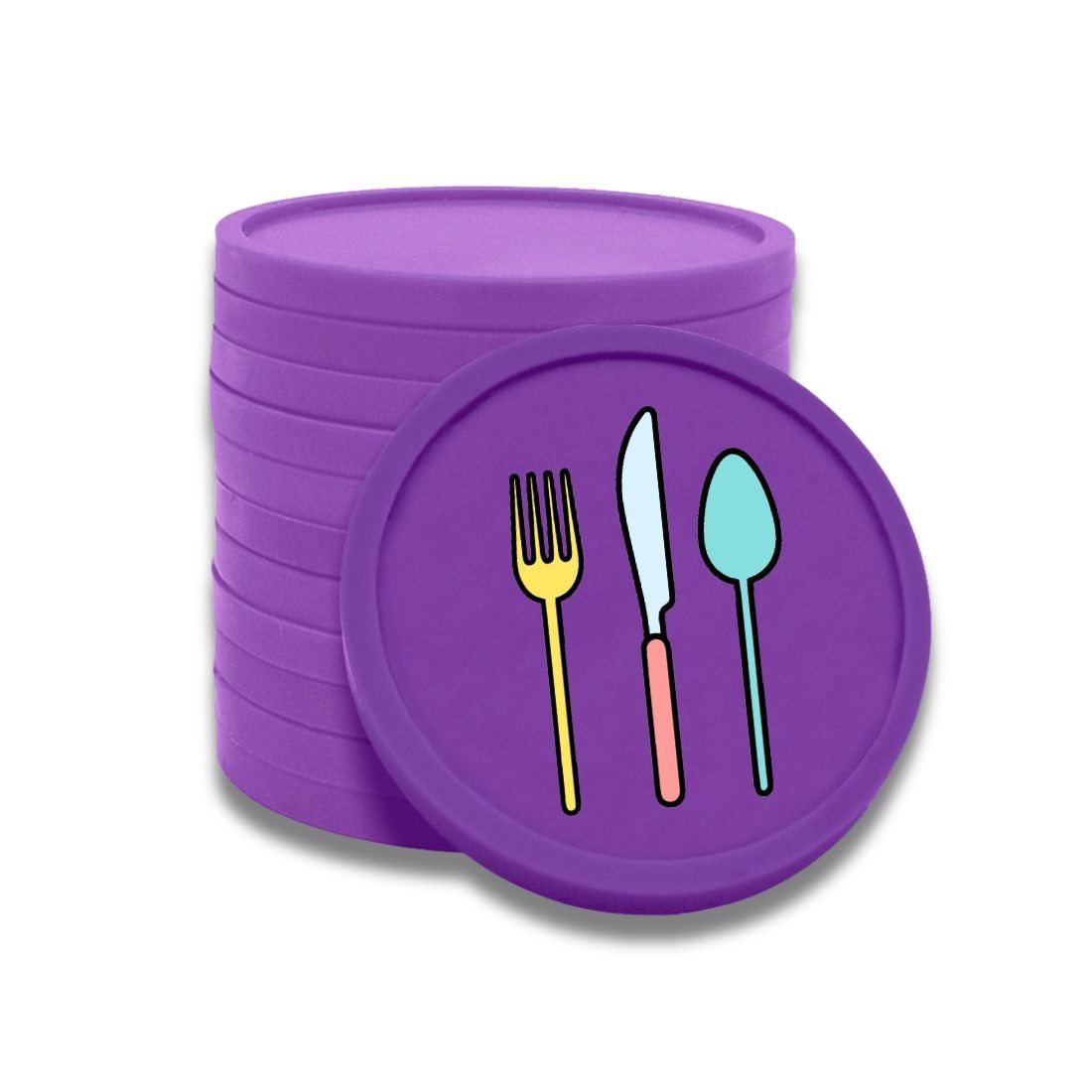 Fichas de 29 mm de diámetro con un reconocible icono de cubiertos en color. Tienen un borde elevado y un grosor de 2,35 mm. Impresión a una o dos caras. Ideales como fichas para bebidas o como método de pago. Se venden en paquetes de 100 unidades.