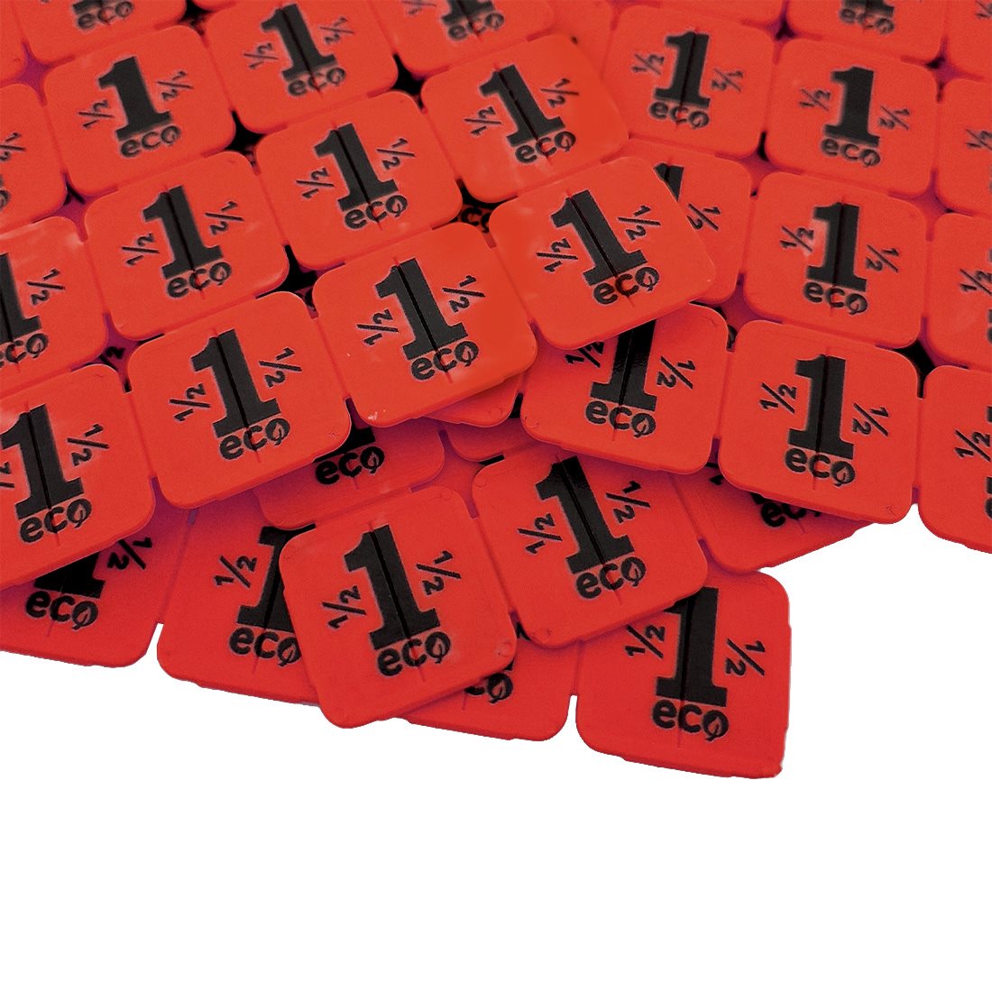 Las fichas están hechas de almidón de patata y son completamente biodegradables, se presentan en laminas de 25 fichas. Cada ficha mide 24 x 24 mm. Presentan el número 1 rodeado  Cada ficha lleva impreso el número 1, con "½" en ambas caras. Las fichas están impresas por ambas cara. Son fáciles de partir por la mitad, por lo que también se pueden usar como fichas de 50 centavos.