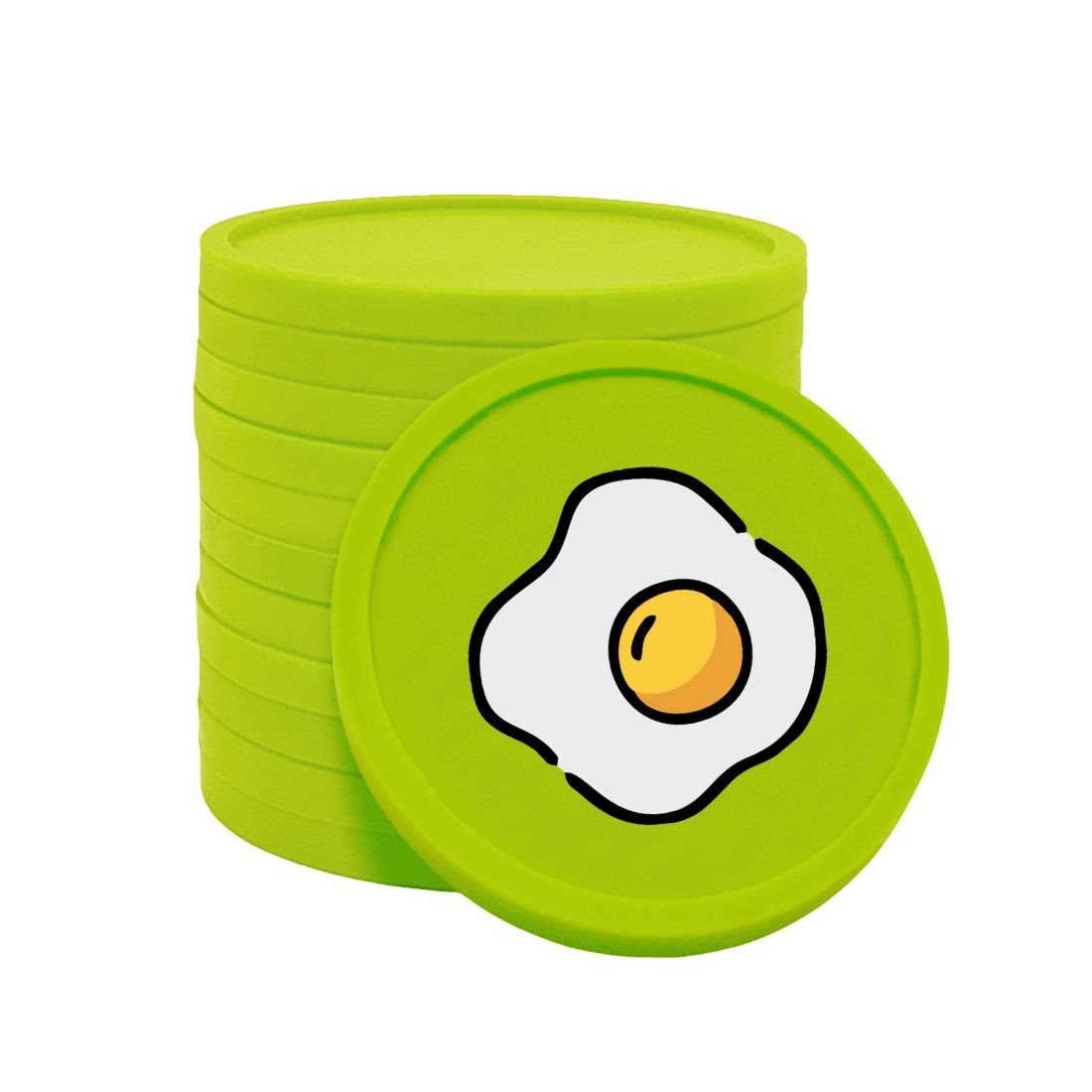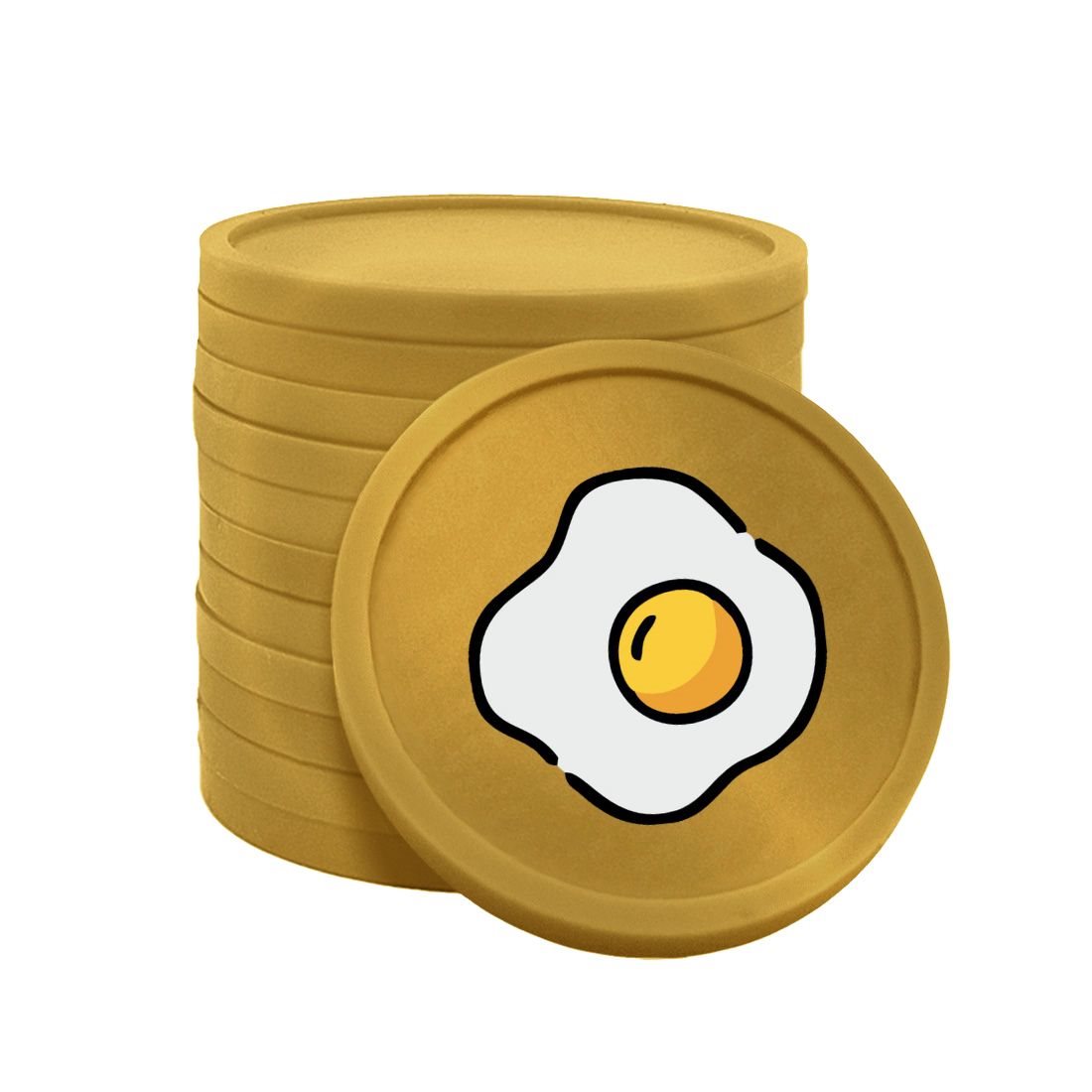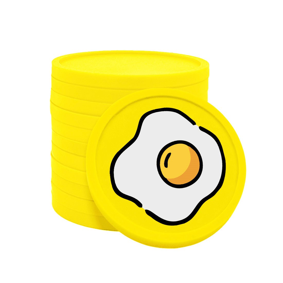 Fichas de plástico de 29 mm con impreso a color, que representan un huevo frito. Todas las fichas tienen un borde elevado y un grosor de 2,35 mm. estas fichas son muy prácticas a la hora de pagar en la barra de refrescos o en el puesto de comida. Se presentan en paquetes de 100 unidades.