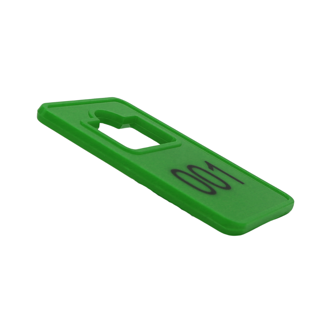 Los números de guardarropa están hechos de plástico 100 % reciclado. Tienen forma rectangular, con unas dimensiones aproximadas de 36,3 x 50,5 mm, y un orificio para colgar de aprox. 21 x 14 mm en la parte más ancha de la ficha.