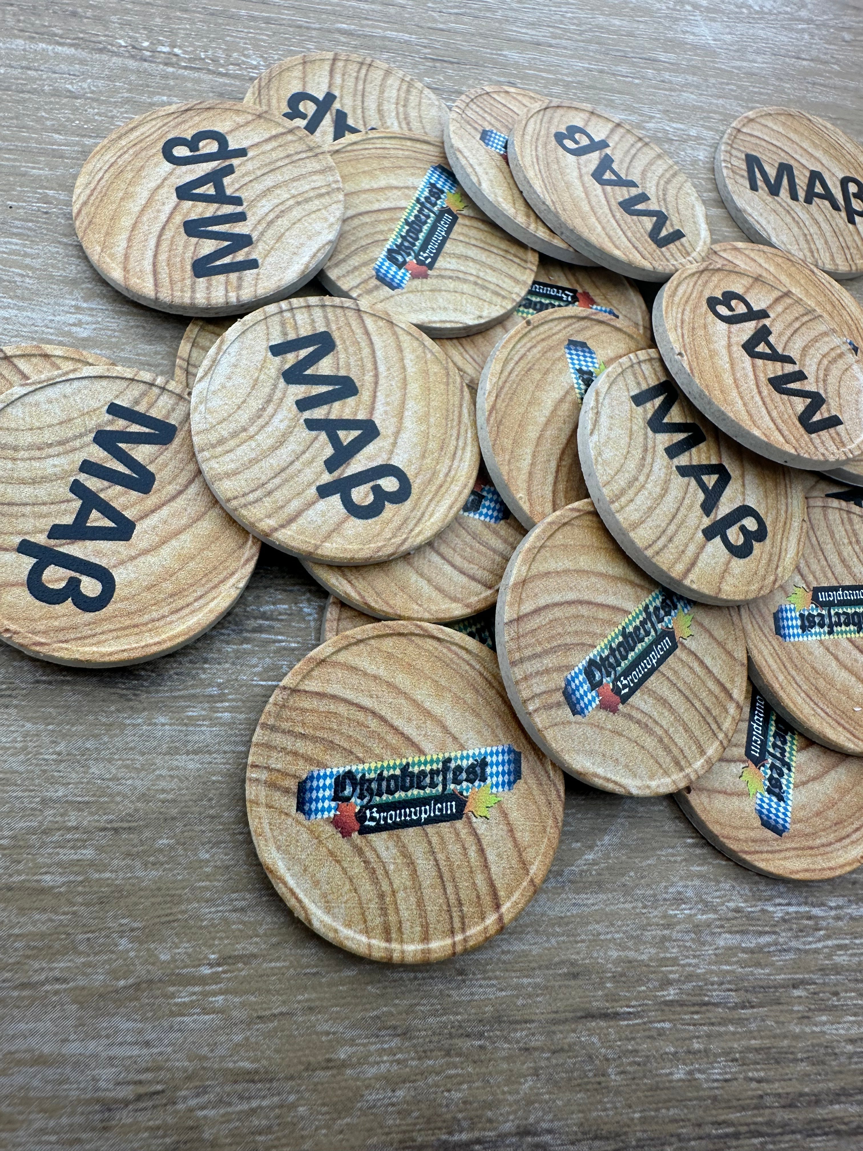 ¿Quieres imprimir fichas sostenibles? Estas monedas están hechas de fibra de madera y resina, lo que las convierte en una alternativa ecológica al plástico. Ideales para fiestas, actividades y juegos. Imprime tu diseño a todo color. 100 unidades.