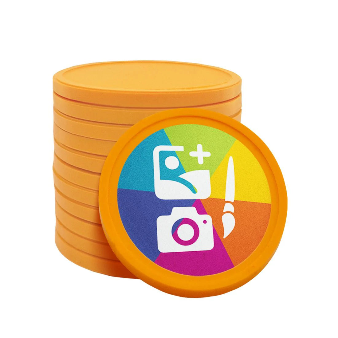 Las fichas de plástico tienen un diámetro de 29 mm y un grosor aproximado de 2,35 mm. Puedes personalizar estas ficahs redondas con su propio diseño a todo color, por una o ambas caras. Si eliges la impresión por ambas caras, puedes elegir un diseño idéntico o diferente. Todas las fichas tienen un borde elevado para proteger la impresión. Las fichas se venden por 100 unidades.