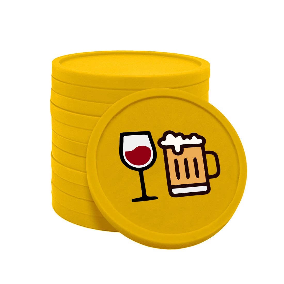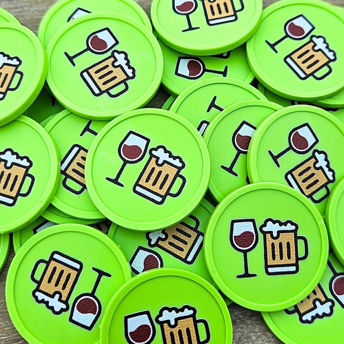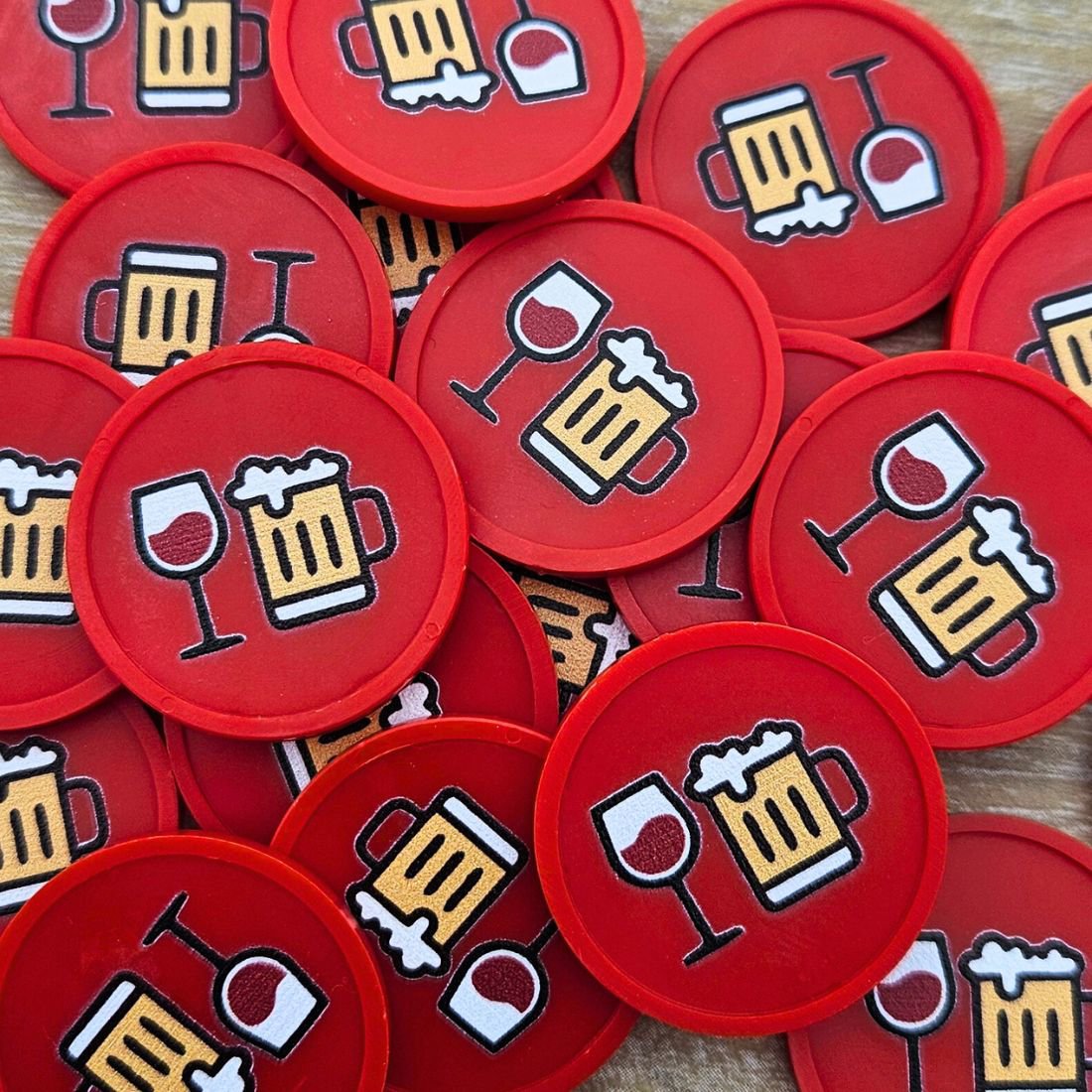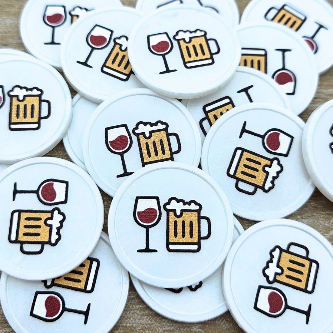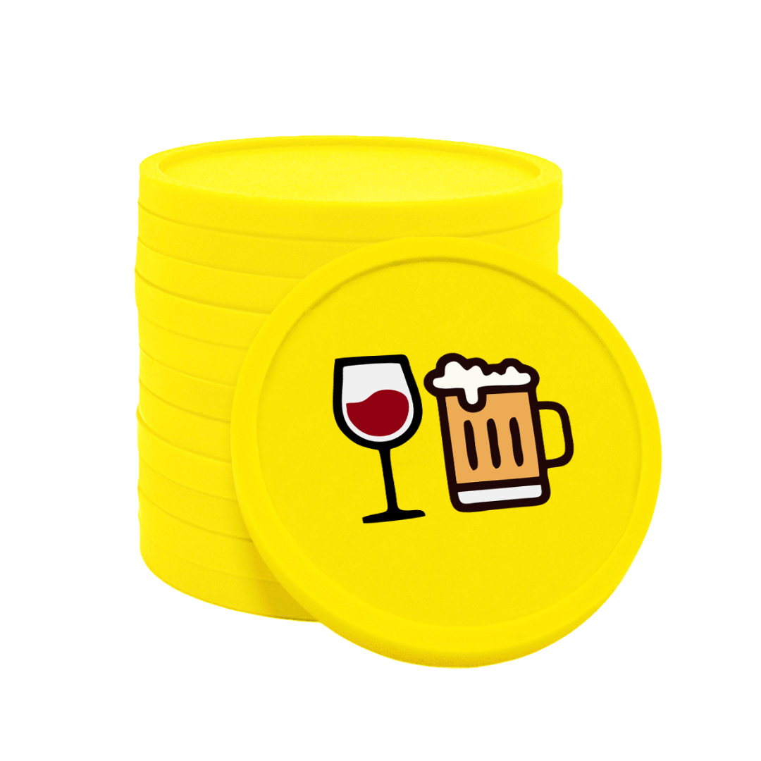 Fichas de 29 mm de diámetro con iconos de cerveza y vino. Tienen un borde elevado y un grosor de 2,35 mm. Impresión a una o dos caras. Ideales como fichas para bebidas o como método de pago. Se venden en paquetes de 100 unidades.