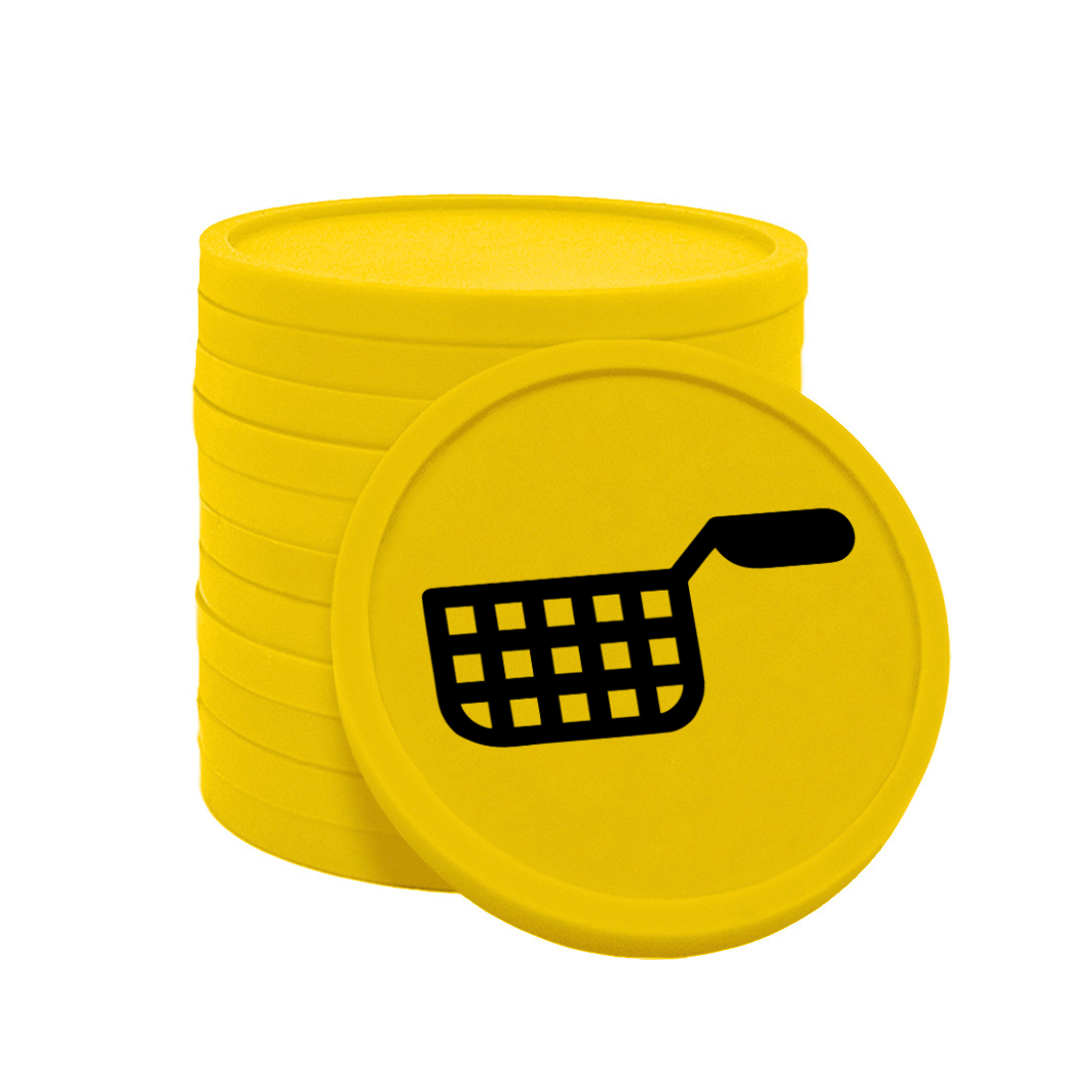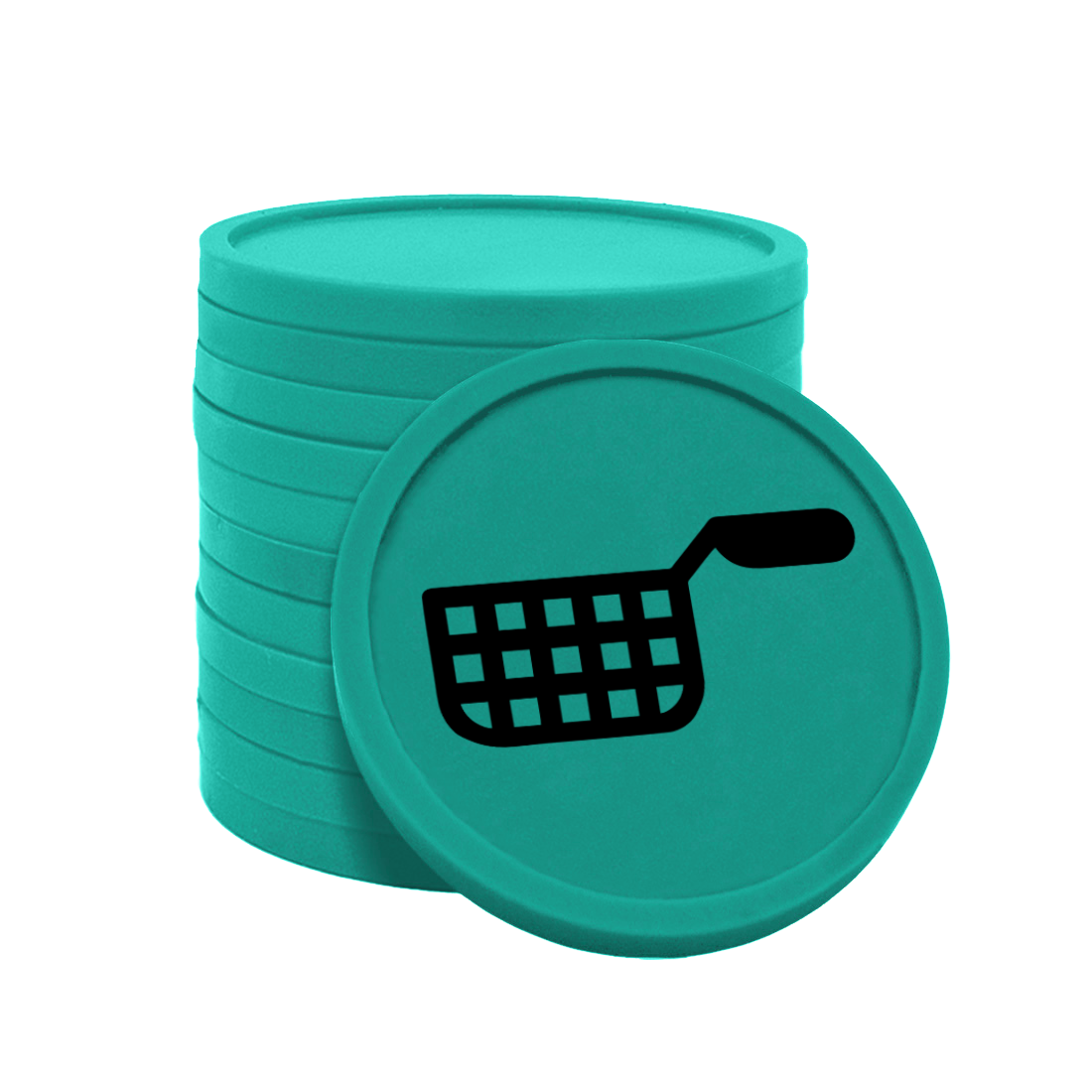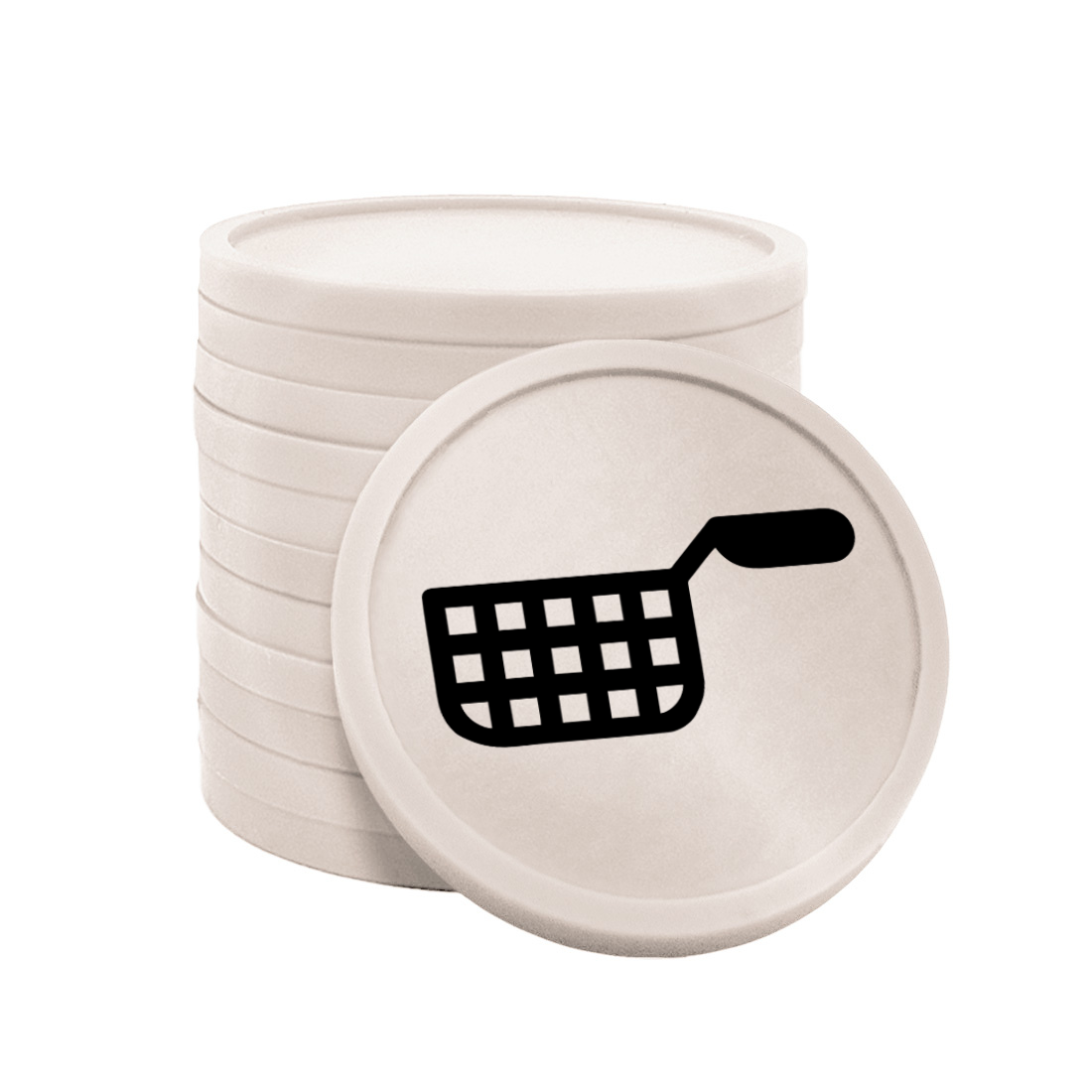 Las fichas son de plástico, tienen un diámetro de 29 mm y un grosor de 2,35 mm. Cada ficha tiene un borde elevado. Puedes imprimirlas por una o ambas caras con nuestro diseño de freidora. Selecciona esta opción antes de añadir las fichas de freidora a tu carrito. Las fichas están disponibles en varios colores llamativos y se pueden pedir en paquetes de 100 unidades.