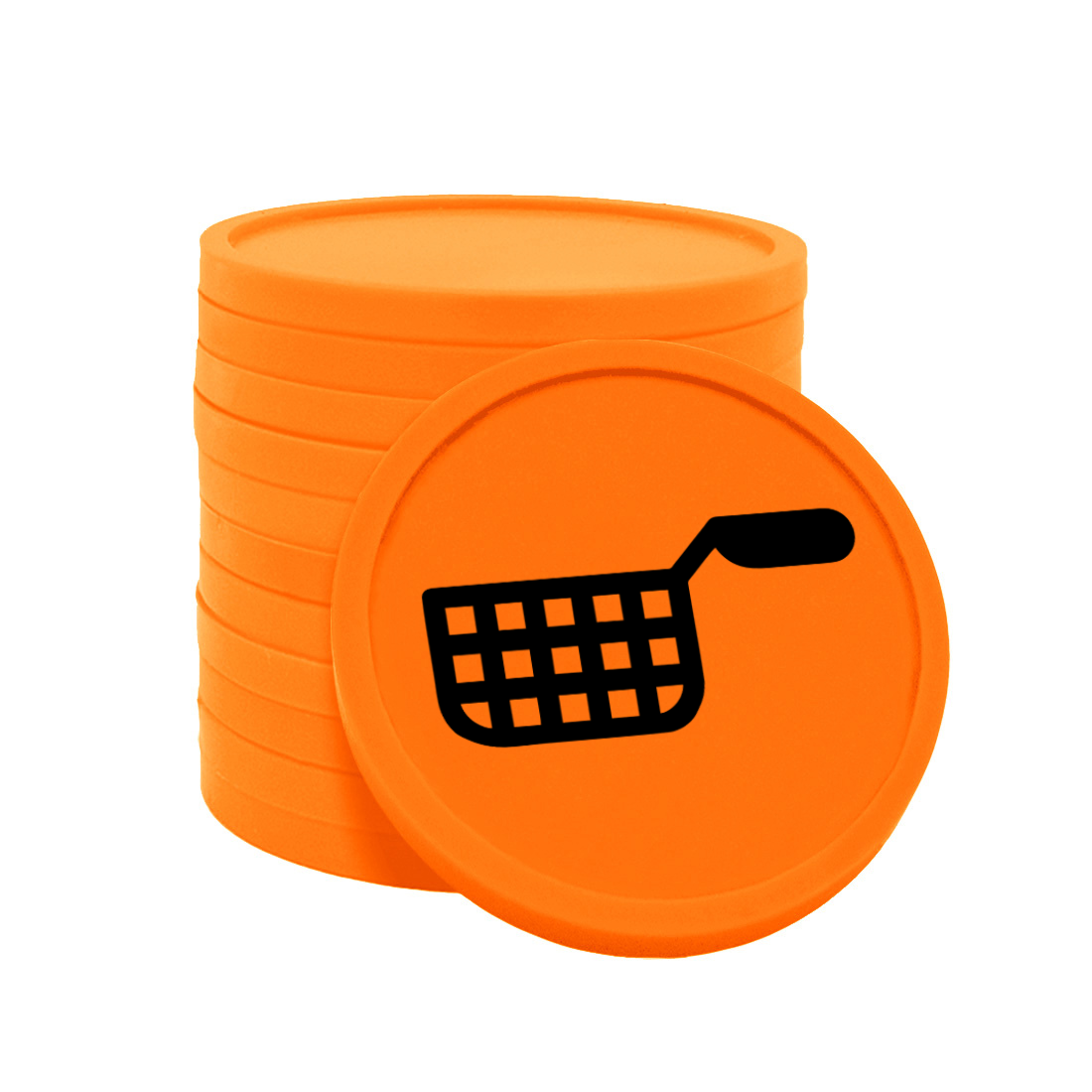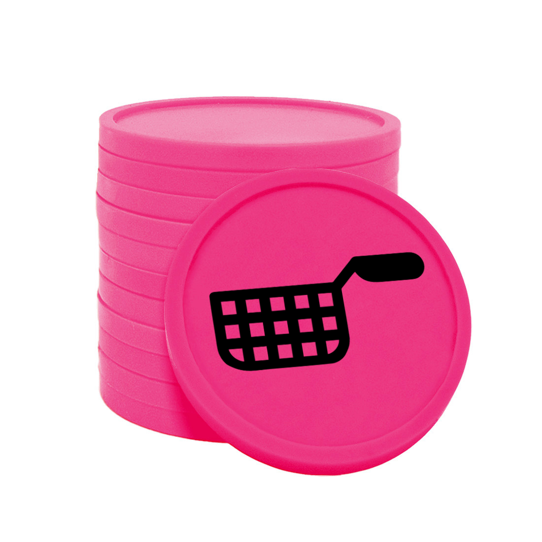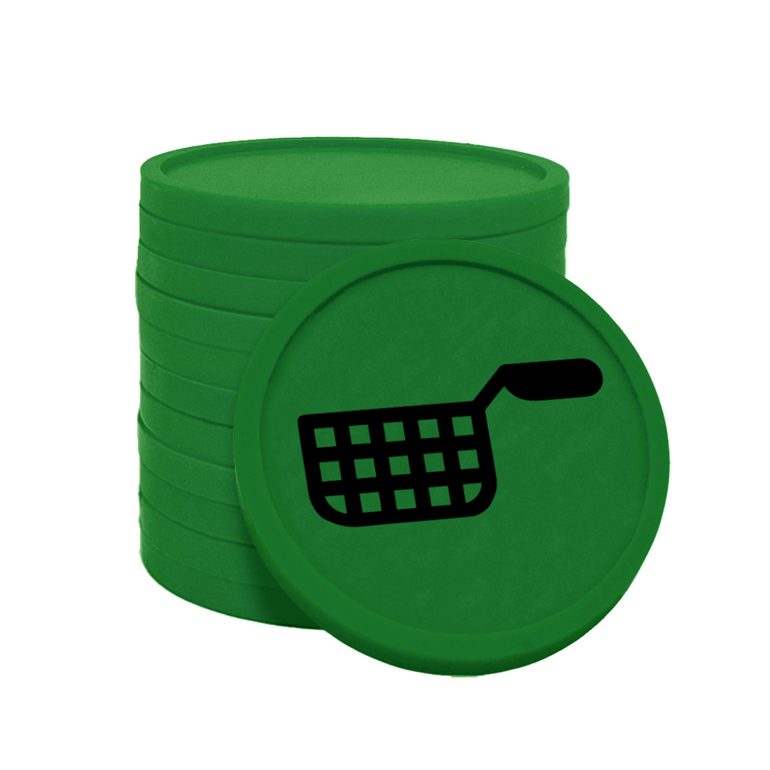 Las fichas son de plástico, tienen un diámetro de 29 mm y un grosor de 2,35 mm. Cada ficha tiene un borde elevado. Puedes imprimirlas por una o ambas caras con nuestro diseño de freidora. Selecciona esta opción antes de añadir las fichas de freidora a tu carrito. Las fichas están disponibles en varios colores llamativos y se pueden pedir en paquetes de 100 unidades.