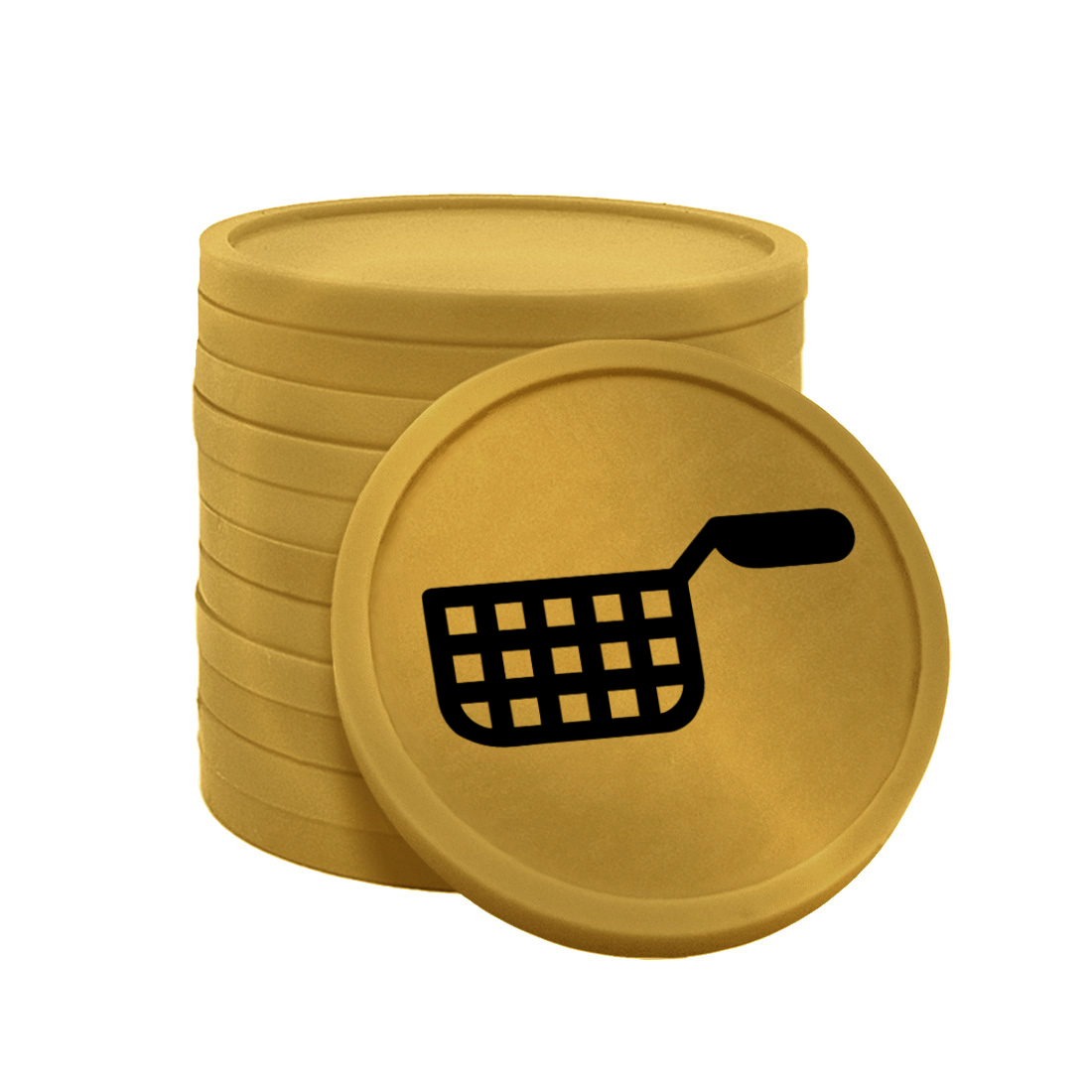 Fichas de 29 mm de diámetro con el icono de freidora. Tienen un borde elevado y un grosor de 2,35 mm. Impresión a una o dos caras. Ideales como fichas para aperitivos o como método de pago. Se venden en paquetes de 100 unidades.