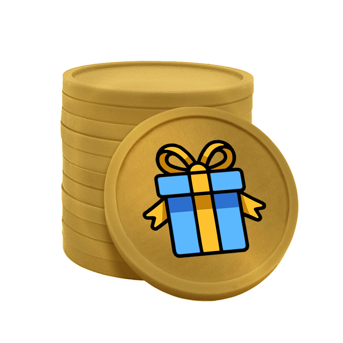 Fichas de 29 mm diámetro con el icono de regalo. Tienen un borde elevado y un grosor aproximado de 2,35 mm. Impresión a una o dos caras. Ideales para hoteles, campings y otros establecimientos de hostelería. Por 100 unidades.