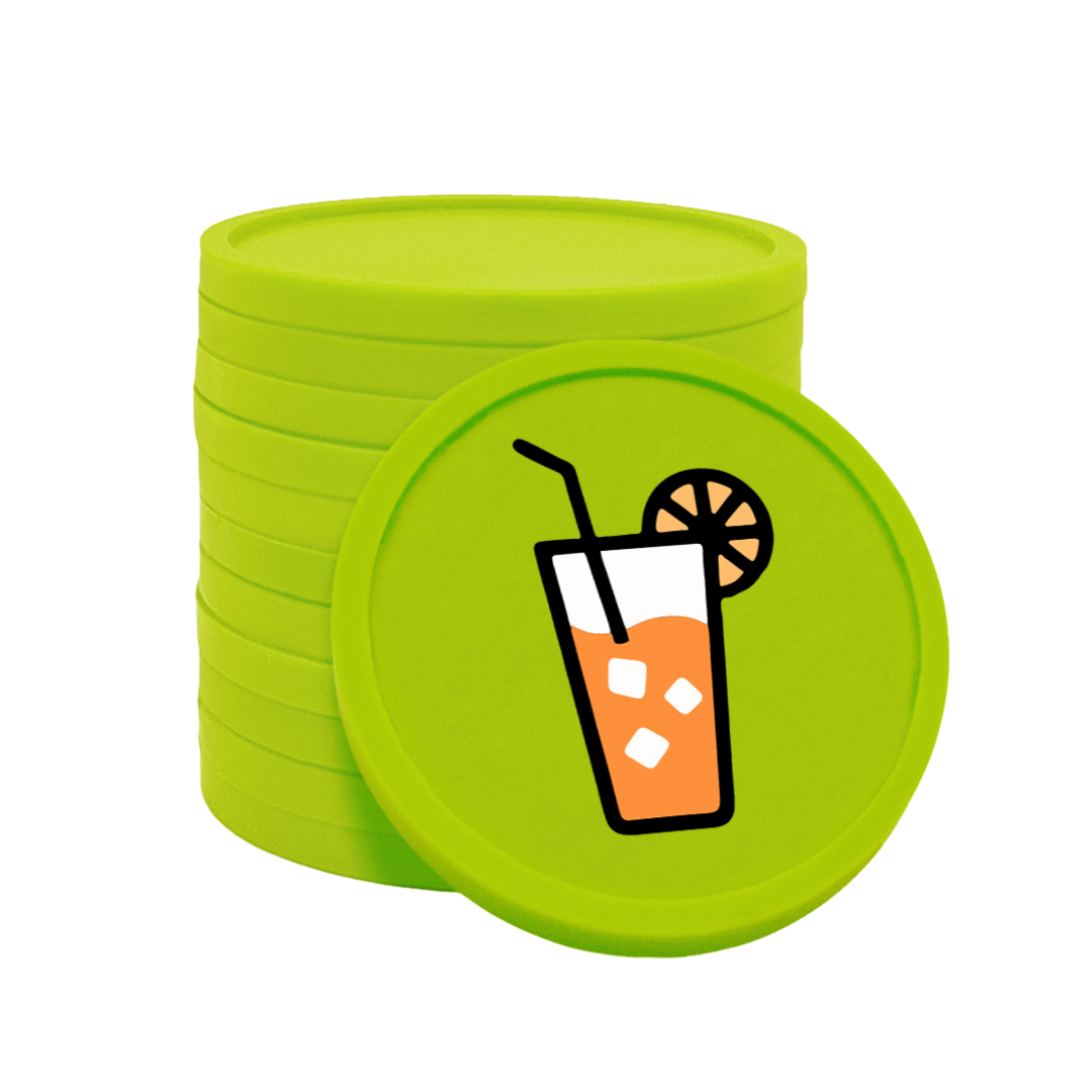 ficchas de 29 mm de diámetro con el icono de un refresco. Tienen un borde elevado y un grosor aproximado de 2,35 mm. Impresión a una o dos caras. Ideales como fichas para consumo o bebidas no alcohólicas. Por 100 fichas.