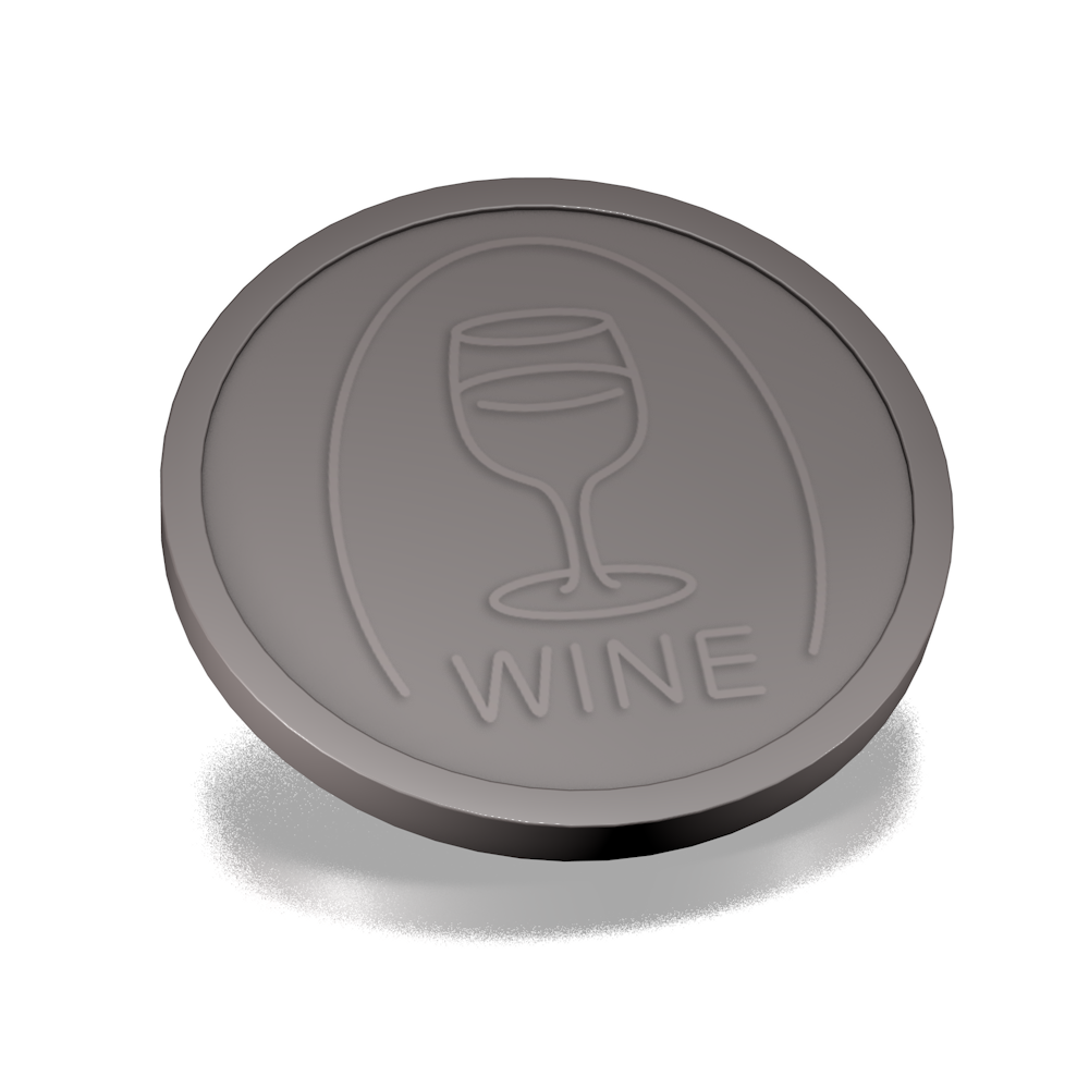 Fichas de plástico de 29 mm con relieve, que representan un copa de vino y la palabra "WINE". Todas las fichas tienen un borde elevado y un grosor de 2,35 mm. Ideales para consumo, bebidas o pagos. Se presentan en paquetes de 250.