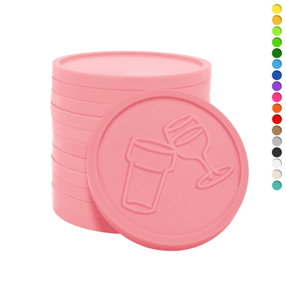 Fichas en varias colores en relieve con un reconocible icono de vaso de cerbeza y copa de vino. Tienen un borde elevado y un grosor de 2,35 mm con un diametro de 29 mm. Son imprescindibles en diversos festivales y eventos. se venden en paquetes de 250 unidades.