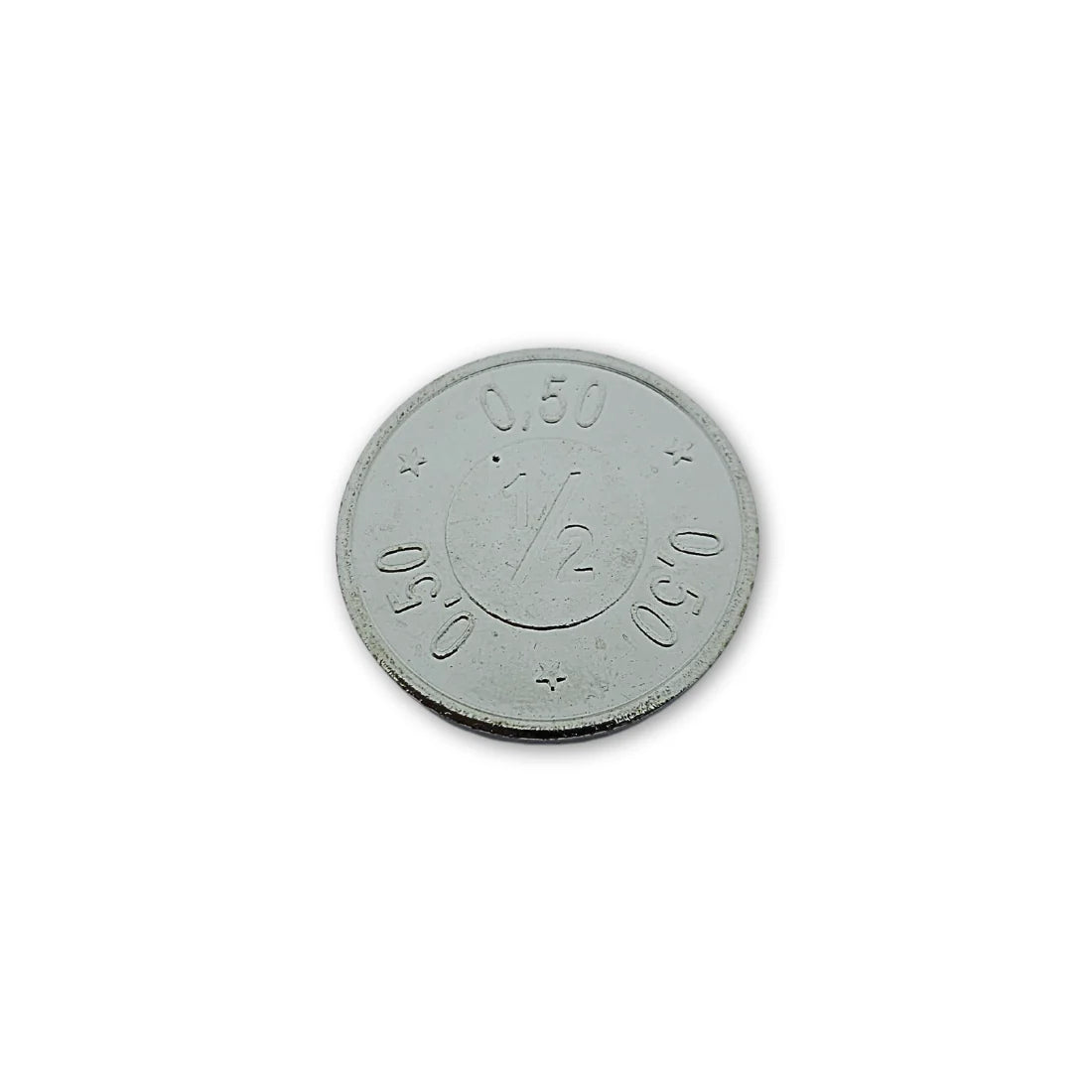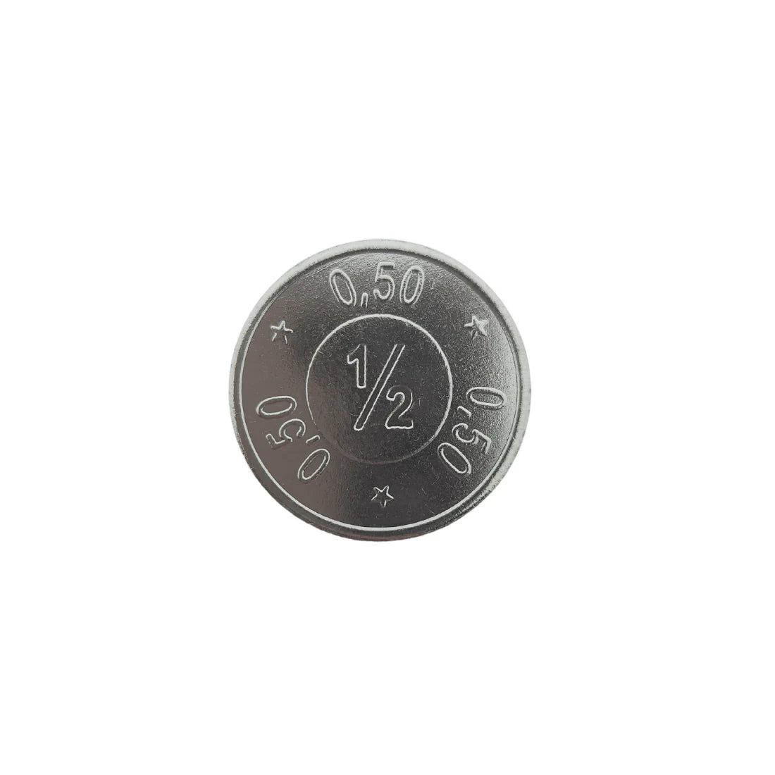 Moneda de acero niquelado con los números ½ , 0,50 y tres corazones. Las monedas tienen un diámetro de 24 mm y un grosor aproximado de 2.3 mm. Ideales como monedas para consumo, bebidas, pagos o juegos. Se presentan en paquetes de 100 unidades.