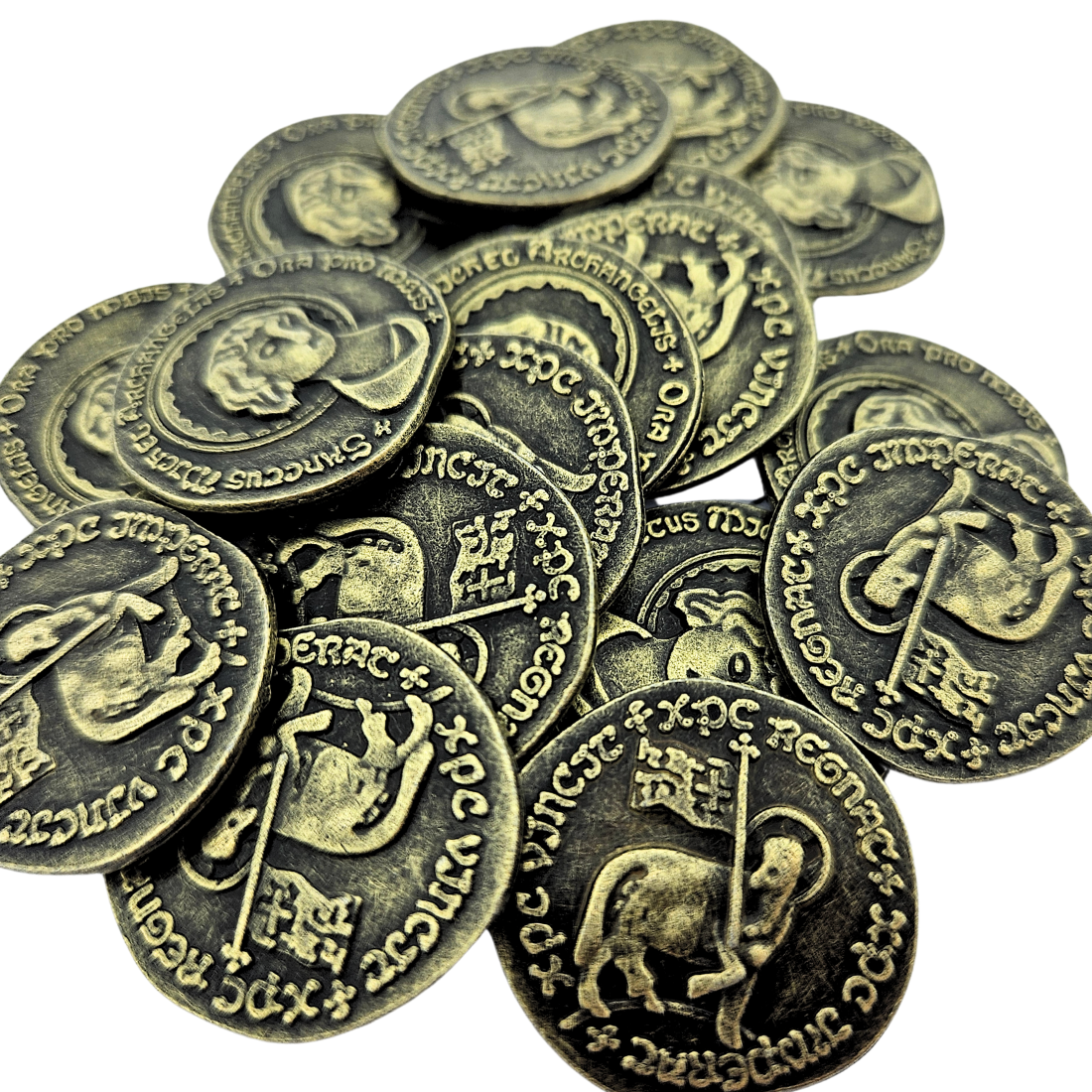 Monedas medievales doradas de bronce fundido, de aproximadamente 24 mm de diámetro. Cada moneda presenta un relieve diferente en ambas caras. Ideales para festivales, obras de teatro y eventos históricos. También son aptas como fichas de juego. Paquete de 100 monedas.